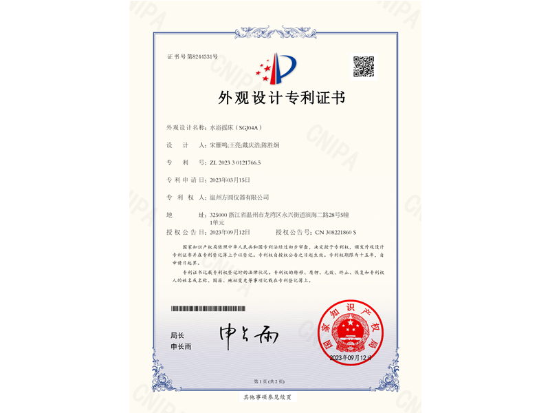 中國外觀設計專利:水浴搖床(ZL 2023 3 0121766.5)