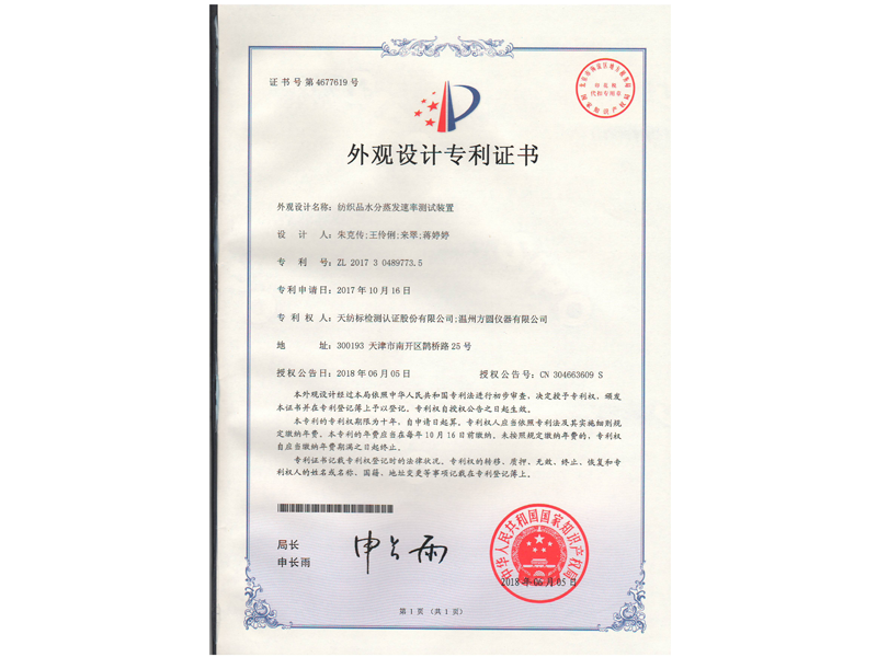 中國外觀設計專利:紡織品水分蒸發(fā)速率測試裝置(ZL 2017 3 0489773.5)