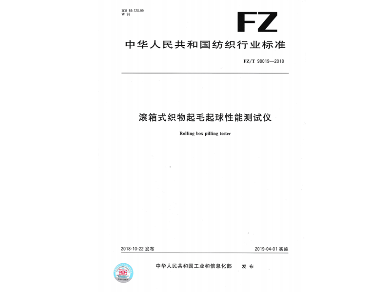 參與起草《滾箱式織物起毛起球性能測試儀》(FZ/T 98019-2018),該標準由中華人民共和國工業(yè)和信息化部于 2018-10-22 發(fā)布
